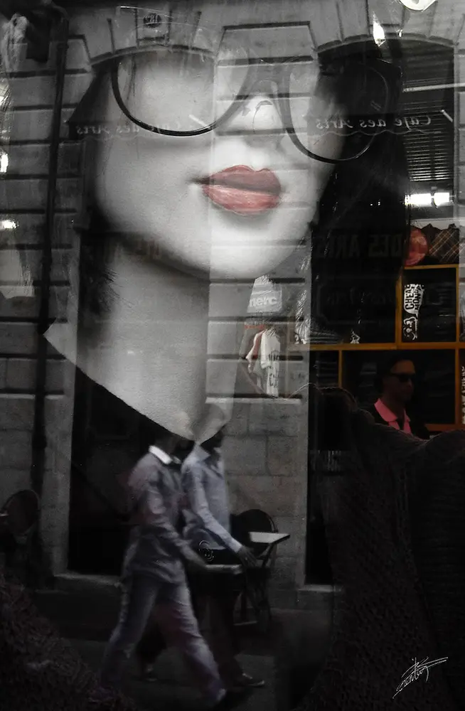 A travers le reflet des vitrines j’observe le monde, la ville, les gens. Discrètement j’examine et je capture. Beauté plastique, mise en scène figée face à l’exaltation de la rue.